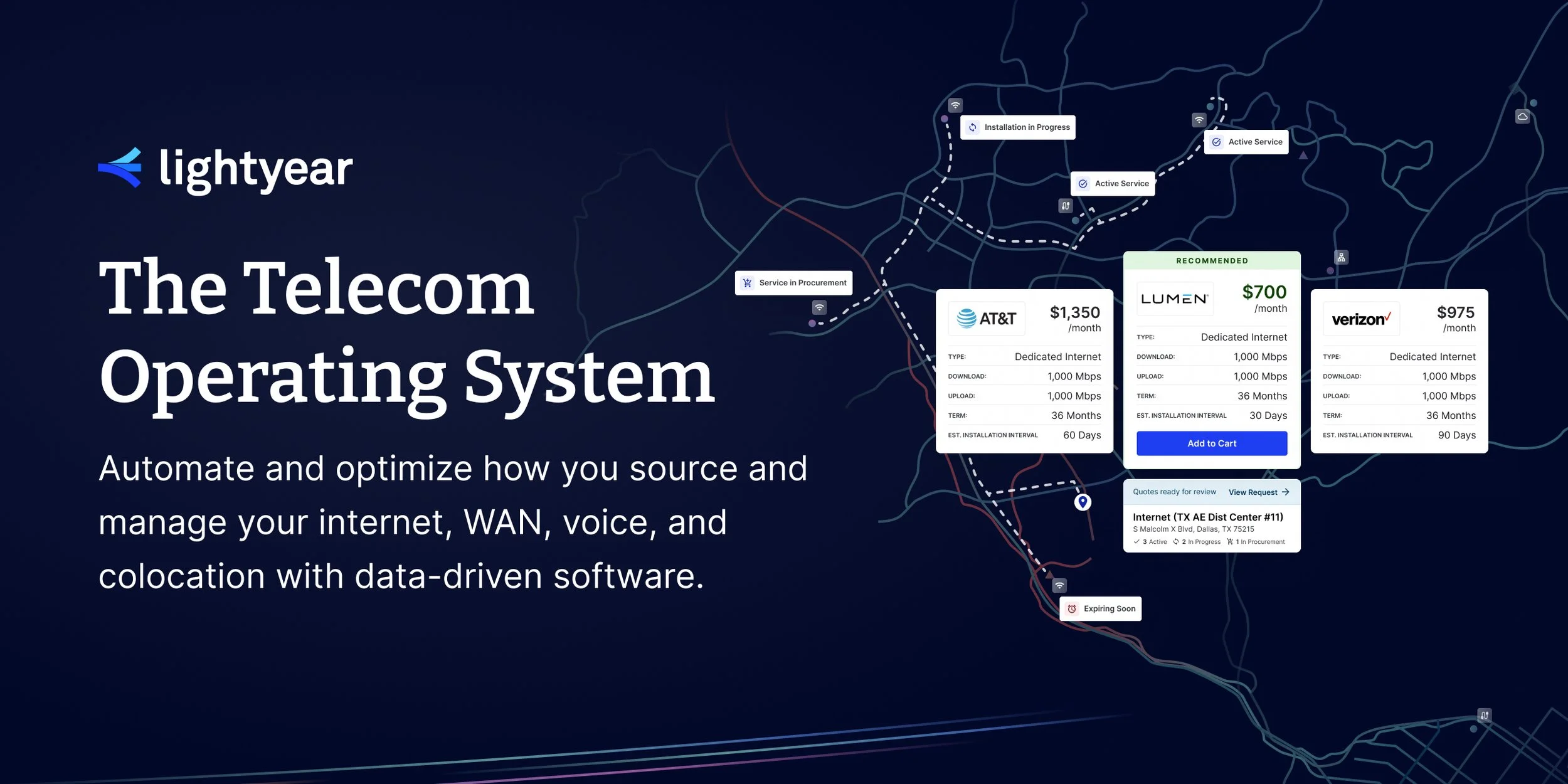 Lightyear automates the procurement and management of telecom services while leveraging proprietary data to enable better, faster strategic decision making. Using Lightyear your organization can spend considerably less time on telecom procurement and vendor management while reducing telecom service costs significantly.